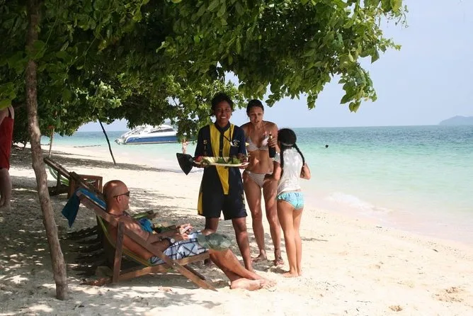 Le soste per lo snorkeling erano ben distanziate, nessuno si è sentito di fretta; lo staff distribuiva l’attrezzatura e controllava tutti, soprattutto i principianti che all’inizio sembravano nervosi ma poi ridevano sott’acqua con la maschera. Pesci ovunque — lampi di giallo e blu che sfrecciavano intorno a noi. Dopo tanto nuotare, siamo sbarcati su Bamboo Island o Koh Rang Yai (a seconda del meteo), dove le palme si piegavano sulla sabbia morbida e qualcuno si è addormentato sotto una palma da cocco fino all’ora di pranzo.