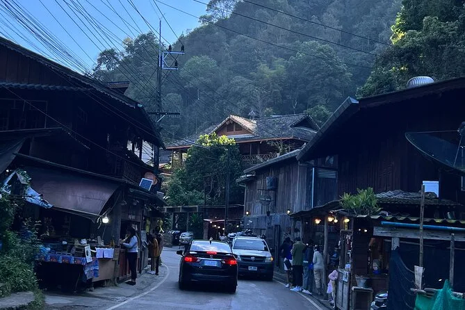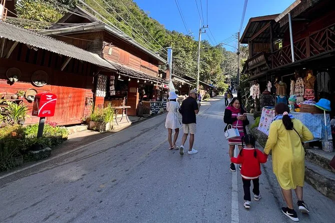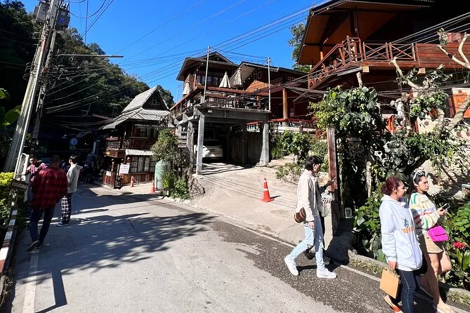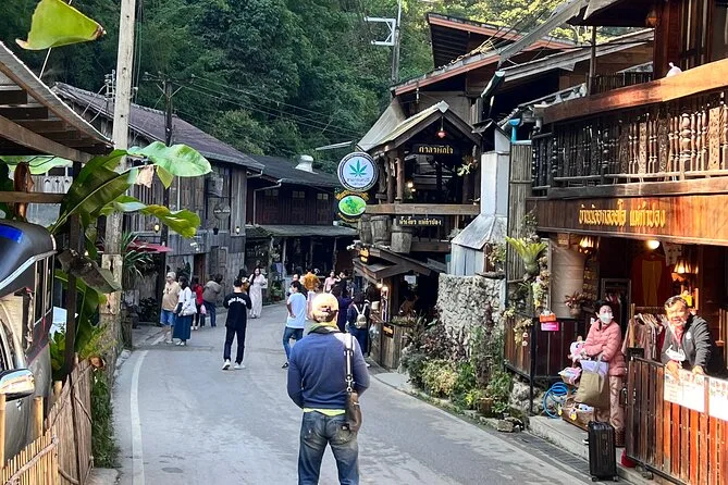 Il pranzo è stato semplice—riso, pollo piccante saltato in padella, una bottiglia d’acqua fresca—condiviso attorno a un tavolo di legno con la nostra guida Got, cresciuto proprio lì vicino. Dopo, ci siamo incamminati verso il villaggio di Ban Mae Kampong. È nascosto tra le colline, con case di legno adagiate lungo un ruscello. Gli abitanti stavano essiccando foglie di tè su vassoi di bambù davanti alle loro case. C’è una calma qui difficile da descrivere; persino l’aria sembra più dolce. Ci siamo fermati al Centro di Apprendimento Comunitario, dove un paio di bambini stavano provando la musica tradizionale. Se ascolti con attenzione, puoi sentire l’acqua scorrere sotto i pavimenti di alcune case.