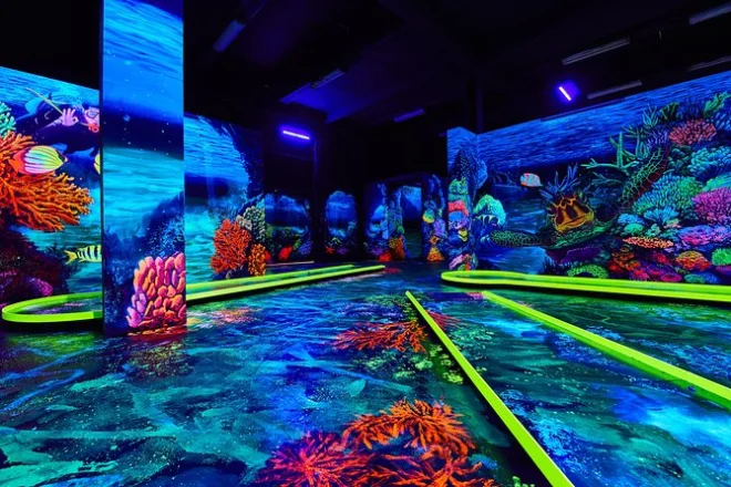 «Non preoccuparti se sbagli — i pesci non se ne accorgeranno», ci ha sorriso la nostra guida mentre ci passava quegli strani occhiali Chromadepth da Neonis. Non avevo mai giocato a minigolf al buio, figuriamoci circondato da meduse fluorescenti e castelli al neon. Il locale è proprio nel cuore di Budapest, a due passi dalla Basilica di Santo Stefano, ma sembrava di essere finiti in un’altra dimensione dove tutto vibra di colori. Il mio primo colpo è stato un disastro (la pallina ha rimbalzato sul muso di uno squalo dipinto), ma a nessuno importava. Si sentiva una risata leggera nell’aria e un profumo dolce — forse popcorn? — che arrivava dalla hall.