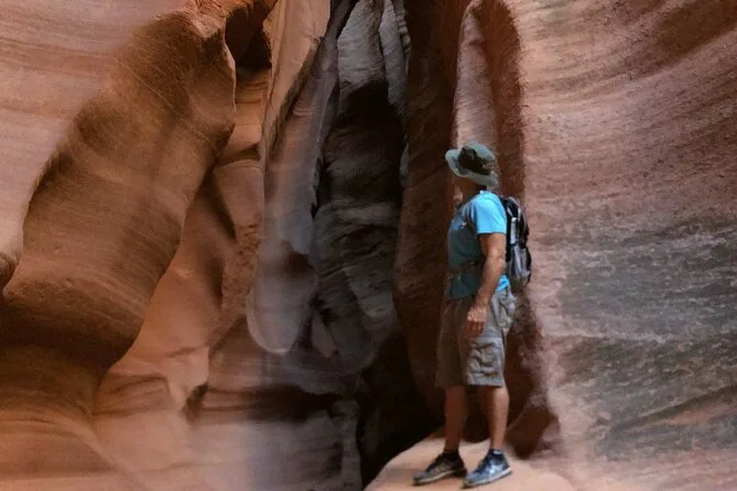 Non sono molto a mio agio su terreni irregolari (le ginocchia hanno protestato un po’), ma non è stato troppo faticoso. Le pareti del canyon cambiavano forma mentre camminavamo — a forma di A qui, a V là — tutte quelle sfumature di rosa e arancione stratificate come se fossero dipinte a mano. James ci ha insegnato a scorgere volti nella pietra; ne ho visto uno che sembrava un cane addormentato. Ci ha raccontato di come le inondazioni abbiano scolpito questo posto in milioni di anni. A volte la sua voce rimbalzava sulle pareti in modo strano e ci faceva ridere. È stata un’esperienza più intima rispetto ad altri tour — niente folle che si spingevano per una foto.