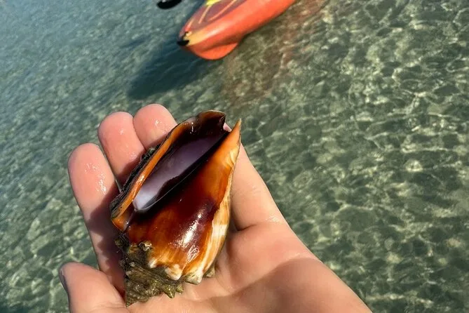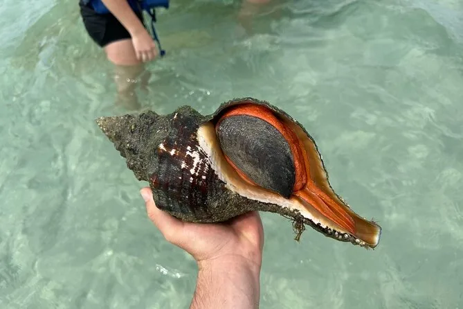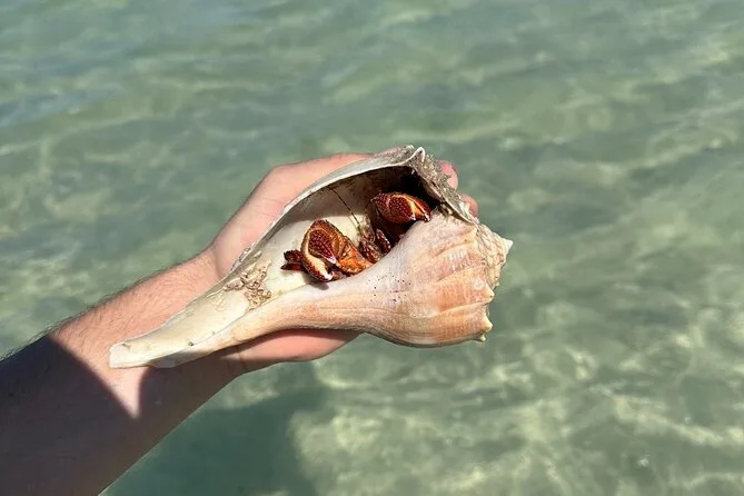 Arrivare all’isola ha preso circa mezz’ora? Difficile dirlo—ero troppo impegnato a cercare i delfini (ne abbiamo visti altri due). Quando siamo sbarcati, la sabbia era calda e granulosa tra le dita dei piedi. Jamie ha distribuito maschere e boccagli (mi dimentico sempre quanto puzzano all’inizio) e siamo entrati in acqua. È più limpida di quanto pensi—un verde chiaro—e c’erano stelle marine appoggiate sul fondo, senza nemmeno cercare di nascondersi. Qualcuno ha trovato una conchiglia grande come una mano. Ancora adesso penso a quella vista sott’acqua: la luce del sole che danza su dollari di sabbia e granchi che corrono di lato.