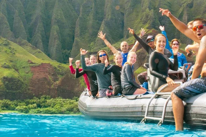 Corri lungo la costa di Na Pali a Kauai su un gommone, avvista delfini che saltano accanto a te, fai snorkeling tra pesci colorati e tartarughe marine, e goditi un pranzo con la tua squadra sotto il sole. Aspettati risate, spruzzi di mare, qualche muscolo indolenzito e ricordi che resteranno a lungo.