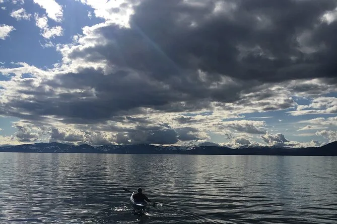Mi è piaciuto che il gruppo fosse piccolo — massimo sei kayak — così non ci si sentiva mai affollati o di fretta. Jamie ha scattato qualche foto per noi (di solito sono timido davanti alla macchina, ma alla fine sorridevo come un matto). C’è stato un momento in cui siamo rimasti a galleggiare vicino ad alcune rocce, osservando piccoli pesci che nuotavano sotto di noi — una sensazione stranamente calma, come se stessimo spiando un altro mondo. Dopo due ore di pagaia lungo la costa nord-est del Tahoe, abbiamo avuto qualche minuto per rilassarci in spiaggia prima di tornare. Ancora oggi penso a quanto fosse silenzioso lì in mezzo a tutto quel blu.