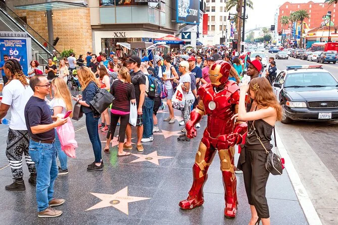 Qualcuno ci fa cenno dal bus fuori dall’hotel: è Marco, la nostra guida per questa giornata a Los Angeles. Già scherza sul traffico (lo chiama “la seconda lingua di LA”) e in un attimo siamo sulla Sunset diretti a Hollywood. La Walk of Fame è più vivace di quanto immaginassi—turisti ovunque, artisti di strada che imitano Michael Jackson, e una signora che vende bottiglie d’acqua a un dollaro. Mi sono ritrovato a sorridere guardando tutti quei nomi sotto i miei piedi. Marco ci ha mostrato la sua stella preferita (Bruce Lee) e ci ha raccontato degli Oscar al Dolby Theatre. Ho scattato una foto facendo finta di vincerne uno, cosa di cui mia sorella si prenderà gioco per sempre.