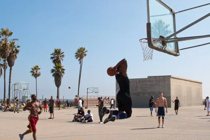 Le tappe si sono susseguite velocemente—prima il molo di Santa Monica, dove si sente davvero l’odore di salsedine e crema solare mescolati (non male, proprio… molto California). C’erano persone che correvano con piccoli cagnolini con gli occhiali da sole. Ho provato il funnel cake a colazione, perché sì, perché no. Poi siamo andati a Venice Beach; musica a tutto volume da un ragazzo che faceva breakdance vicino a Muscle Beach, skater che sfrecciavano davanti ai muri ricoperti di graffiti. Siamo scesi fino ai canali—lì era tutto tranquillo, solo qualche anatra e qualcuno che suonava la chitarra su un portico. Non sembrava una città qualunque in cui fossi stato.
