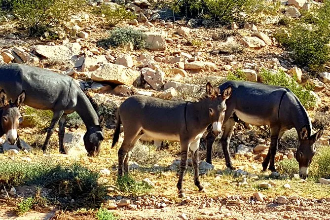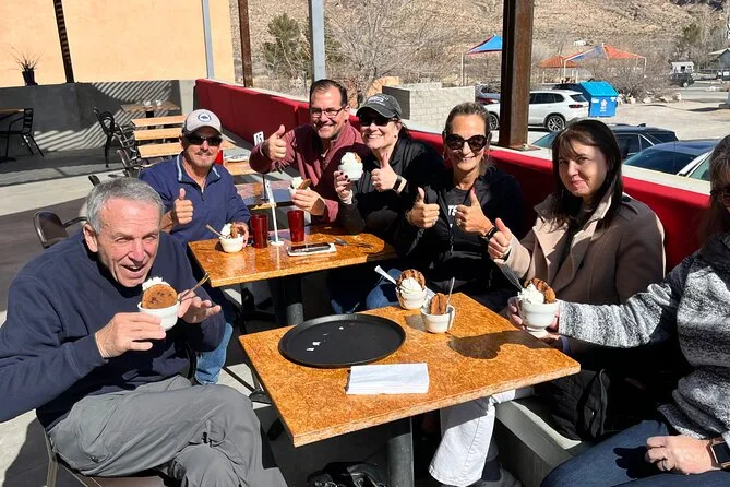 La parte che mi ha sorpreso di più è stata Blue Diamond. È un minuscolo paese minerario incastonato in mezzo a tutta quella natura selvaggia — vecchie case di legno, un negozio generale con insegne sbiadite, e anche asini selvatici che girano liberi come se fossero i padroni del posto (e forse lo sono davvero). Abbiamo preso uno spuntino in un piccolo caffè all’aperto dove una signora anziana ci salutava dalla veranda dall’altra parte della strada. Le montagne sembravano enormi da lì; ricordo di aver pensato che avrei potuto stare seduto su quella terrazza per ore, se non avessi avuto la navetta che ci aspettava.