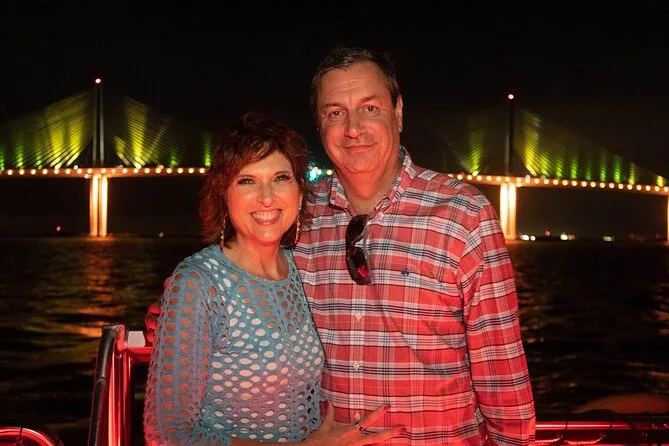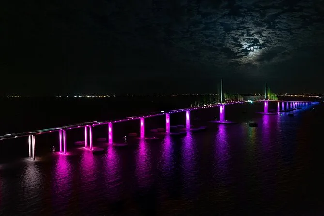 Di ritorno a bordo, dopo il tramonto — il cielo è passato dall’arancione bruciato al viola — non ho ancora voglia di lasciare l’isola. L’equipaggio passa snack e racconta di come a volte i delfini li seguano fino a casa (ne abbiamo visti due prima, o forse era un delfino molto veloce). Poi arriva lo spettacolo di luci sul ponte Skyway, molto più spettacolare di quanto immaginassi — 15 milioni di dollari in LED che si riflettono sull’acqua mentre qualcuno cerca di scattare la foto di gruppo ma ride così tanto da non riuscire a tenere ferma la macchina. È perfetto così.