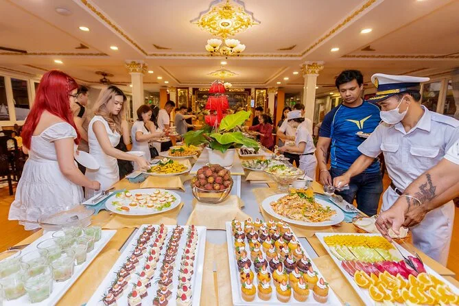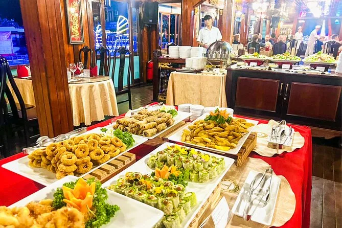Per cena avevo scelto il buffet (non riuscivo a decidere cosa prendere), ma c’erano anche menù fissi. Minh ci aveva ricordato di scegliere in anticipo — a quanto pare non si può cambiare una volta a bordo. Lo staff si muoveva con discrezione, portando piatti profumati di citronella e pesce alla griglia. Ho provato a dire “cảm ơn” a una di loro; ha sorriso gentilmente, anche se probabilmente l’ho detto male. L’aria era calda ma piacevole, e ogni tanto una brezza portava con sé sentori di fango del fiume e qualche nota floreale da monte.