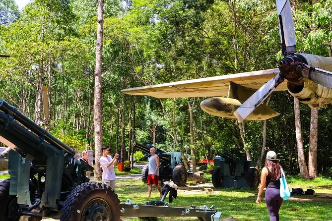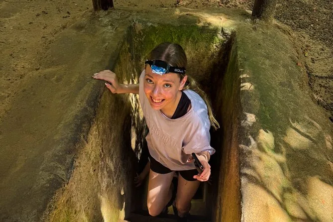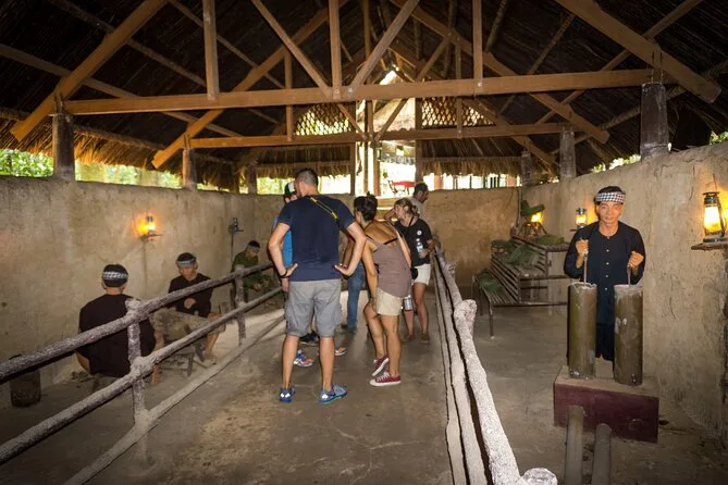 Abbiamo assaggiato la manioca bollita con un pizzico di arachidi — quello che mangiavano i combattenti durante la guerra. Semplice ma saziante; niente male se hai fame o sei curioso come me. Alcuni hanno provato a sparare al poligono (costo extra), ma io ho evitato — troppo rumore per i miei gusti. I tunnel? Umidi, bui, sorprendentemente freschi in certi punti… continuavo a pensare a cosa significasse vivere lì sotto per settimane intere.
