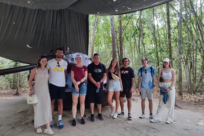 L’aria ai Cu Chi era densa, con un leggero odore di terra umida e foglie vecchie. Abbiamo iniziato sopra terra, osservando crateri di bombe e resti arrugginiti sparsi sotto gli alberi. È strano — ora tutto sembra tranquillo, ma Hien ci ha mostrato dove i soldati si nascondevano o cucinavano sottoterra senza farsi scoprire dal fumo. Ci ha fatto vedere un piccolo ingresso nascosto sotto le foglie; ho provato a sollevare la copertura e quasi me la sono fatta cadere sul piede (Hien ha riso). Strisciare dentro è stato… onestamente un po’ surreale. Fa buio, è stretto e senti la terra rossa sfiorarti le braccia. Continuavo a pensare a come la gente vivesse lì sotto per giorni interi.
