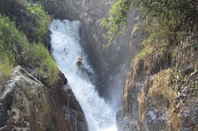 La prima scogliera asciutta è di 18 metri; poi ci sono calate di 15 metri e infine una discesa di 25 metri sulla cascata.