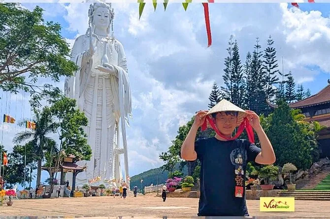 La cascata Pongour era più lontana, a circa un’ora di macchina a sud di Da Lat, ma valeva la pena per la sua ampiezza e le sue cascate a più livelli — la chiamano “le sette cascate”. C’è un rombo costante che rende la conversazione quasi intima. A un certo punto mi sono seduto su una roccia e ho lasciato che la nebbia si posasse sulle braccia. Abbiamo mangiato riso appiccicoso da una bancarella lungo la strada (non incluso nel tour, ma Minh conosceva la signora che lo vendeva). Poi ci siamo fermati alla pagoda Linh An per ammirare la cascata Elephant — quel giorno era chiusa da vicino, ma vederla accanto alla statua della Dea Lady più alta del Vietnam è stato comunque emozionante. La gente lasciava offerte ai suoi piedi; l’incenso si alzava in spirali lente.