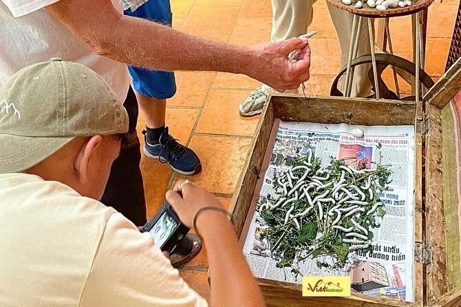 Non pensavo che la visita alla fabbrica della seta mi avrebbe appassionato così tanto. L’odore dell’acqua calda e del bozzolo grezzo è stranamente dolce — si vedevano queste donne che filavano fili così sottili da essere quasi invisibili. C’è qualcosa di ipnotico in tutto questo. Alla fattoria dei grilli (sì, davvero), abbiamo potuto tenerne uno in mano — sono più leggeri di quanto pensassi — e assaggiato uno snack croccante a base di grilli che Minh assicurava “va bene con la birra”. Non credo che ne avrò voglia di nuovo, ma insomma, quando sei in Vietnam…