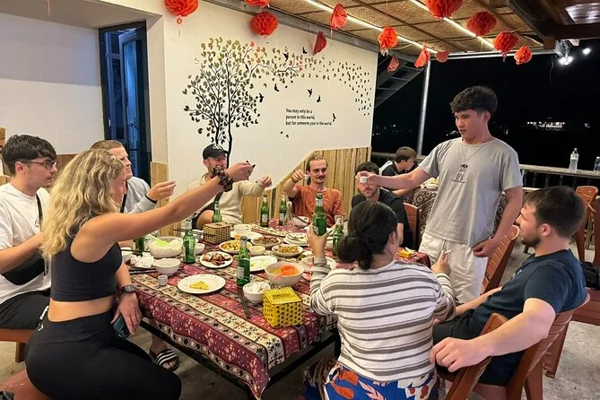 Poi, forse già pomeriggio, siamo arrivati al villaggio di Du Gia. I bambini salutavano dalle porte e qualcuno arrostiva pannocchie lungo la strada. Dopo aver fatto il check-in nel nostro homestay (camera privata, materasso sottile ma lenzuola pulite), siamo scesi a piedi verso la cascata. L’acqua fredda sui piedi stanchi è stata una vera coccola, meglio di qualsiasi spa. Quella sera abbiamo cenato con i nostri ospiti; il vino di riso girava e io cercavo di stare al passo, ma ho fallito alla grande. Però ci siamo fatti tante risate.