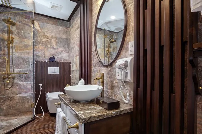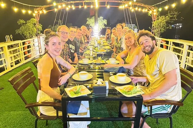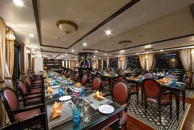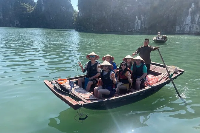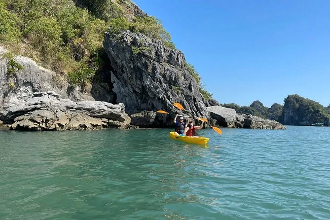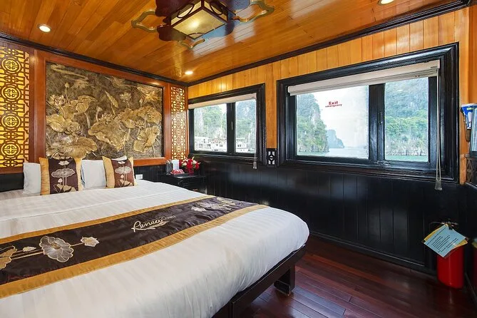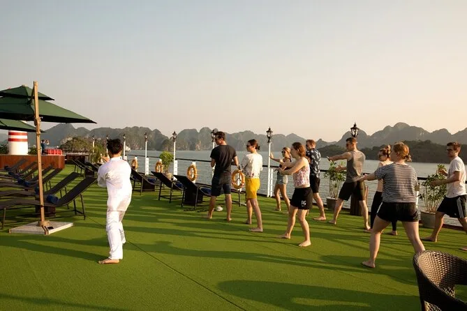 Il viaggio include il transfer dagli hotel del Quartiere Vecchio di Hanoi al porto di Ha Long e ritorno a fine tour. Sono comprese tutte le tasse d’ingresso per grotte e isole lungo il percorso, più tutti i pasti a bordo—specialità vietnamite con opzioni vegetariane se richieste—preparati freschi ogni giorno. La tua cabina privata con balcone ha aria condizionata e bagno privato; gli asciugamani sono sempre pronti dopo le soste per kayak o nuoto. Tra le attività: pedalate nel villaggio di Viet Hai (itinerario Lan Ha), dimostrazioni di cucina, sessioni di tai chi all’alba, gite in barca di bambù con i locali, feste al tramonto sul ponte, attrezzatura per la pesca ai calamari di notte—tutto questo ti aspetta tra le isole.