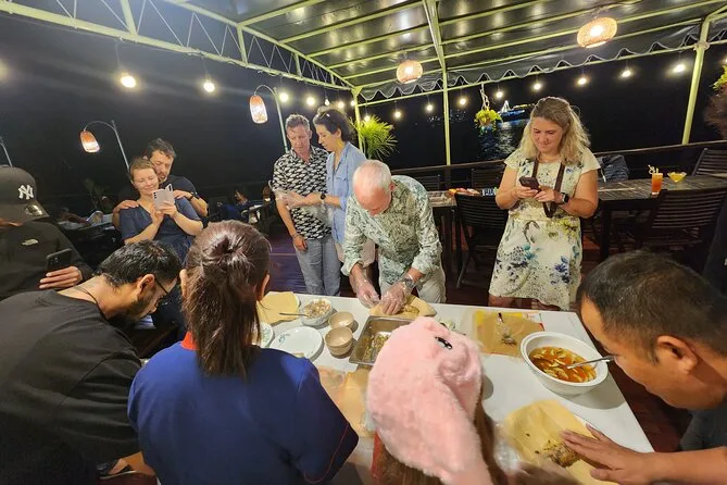 La seconda mattina è stata più lenta — forse per l’alba su Lan Ha Bay, o forse perché finalmente ho dormito bene in quella cabina con il suo piccolo balcone. La colazione era caffè forte e bánh mì, mentre qualcuno faceva tai chi sul ponte (io ho guardato, lo ammetto). Più tardi abbiamo pedalato nel villaggio di Viet Hai; una signora anziana mi ha sorriso quando per poco non cadevo dalla bici schivando delle galline. A bordo c’era una lezione di cucina — ho provato a preparare gli involtini primavera ma i miei sembravano piccoli cuscini. La cena era di nuovo a base di pesce (i gamberi il mio piatto preferito), e dopo il tramonto Minh ci ha mostrato come pescare i calamari dalla poppa della barca. Non abbiamo preso nulla, ma ci siamo divertiti un mondo.