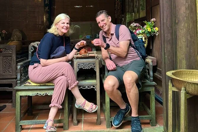 Dopo siamo andati a Hoi An mentre calava il crepuscolo. Tutto brillava di oro e rosa — sai quella luce strana poco prima del tramonto? Faceva sembrare il Ponte Giapponese quasi irreale. Minh ci ha raccontato la sua storia (ho capito solo metà perché ero distratta da un gruppo di bambini che correvano con le lanterne). Siamo entrati anche nella Phung Hung Ancient House; scricchiolava sotto i piedi e odorava di legno vecchio e incenso. C’era una signora anziana seduta sulla soglia che ci ha sorriso senza dire una parola — mi è piaciuto quel silenzio.
