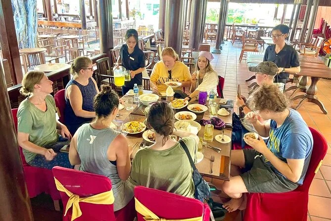 Il Fairy Stream è stato più fresco di quanto immaginassi—letteralmente fresco ai piedi. Si cammina a piedi nudi in un’acqua bassa che serpeggia tra scogliere rosse e sabbia chiara. A un certo punto Hieu mi ha passato un pezzo di argilla dalla riva (“fa bene alla pelle,” ha detto), così me ne sono spalmato un po’ sul braccio come un locale. Il sole era già alto, ma sotto le palme da cocco a pranzo si stava in un’atmosfera di relax totale. Il pranzo era semplice—riso, pesce alla griglia, tante erbe—ma dopo aver camminato a piedi nudi nel ruscello aveva un sapore perfetto.