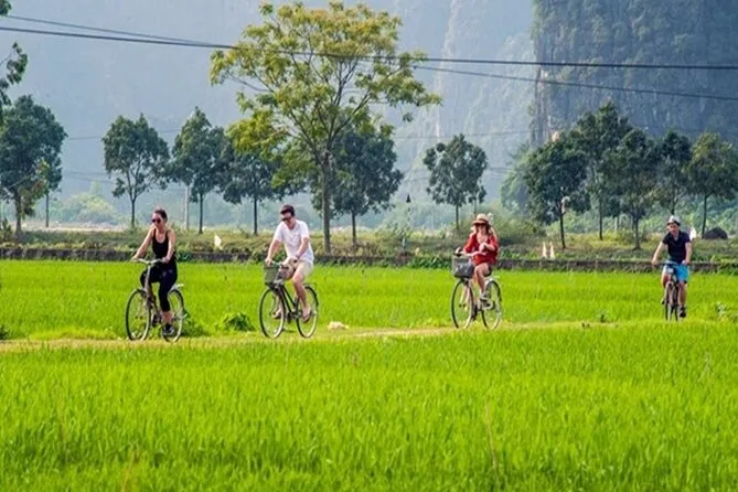 Il tuo giorno include il pick-up e drop-off in hotel con minibus limousine dal quartiere vecchio di Hanoi, i biglietti d’ingresso per tutti i siti (templi di Hoa Lu, tour in barca a Trang An, Mua Cave), un’ora di pedalata in campagna con la guida che racconta storie, un pranzo buffet vivace con specialità regionali (acqua minerale inclusa) e un tè vietnamita prima del rientro in serata.