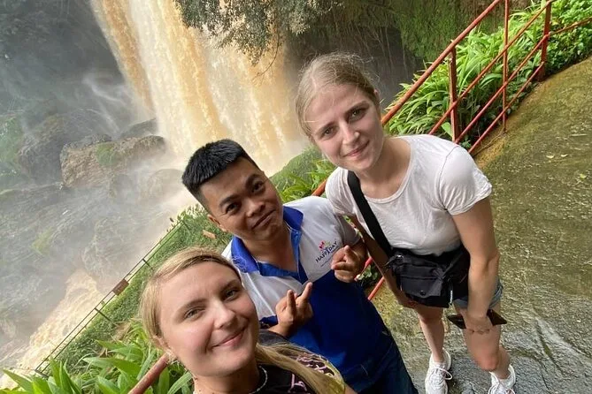 La seconda tappa è stata la cascata Elephant, o Lieng Rowoa come la chiamano alcuni. Qui il fragore è più forte—la senti prima ancora di vederla. Il sentiero per scendere è un po’ scosceso (fai attenzione!), ma la vista in fondo ripaga ogni passo. La nebbia ti avvolge e si sente un profumo di muschio e alberi antichi. Minh ci ha mostrato le liane che si avvolgono intorno ai tronchi, alcune vecchie di secoli. Vicino c’è anche la pagoda Linh An Tu, con una grande statua di Buddha che sembra vegliare su tutto. Ci siamo fermati qualche minuto ad ascoltare solo il rumore dell’acqua e i canti dei monaci in lontananza.