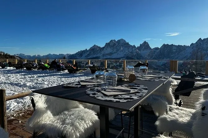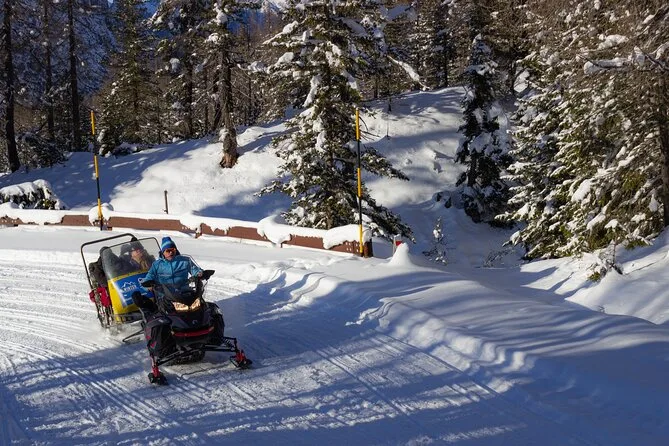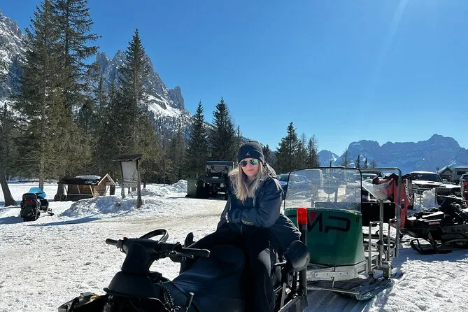 Your day includes pickup in Venice, transport by air-conditioned mini-van with your local driver-guide throughout the Dolomites winter landscapes, all scheduled stops such as Cortina d’Ampezzo and scenic lakes, plus options for snowmobile rides or cable car tickets depending on conditions (extra fee applies). Lunch is at your own expense at cozy mountain huts along the way before returning to Venice in the evening.