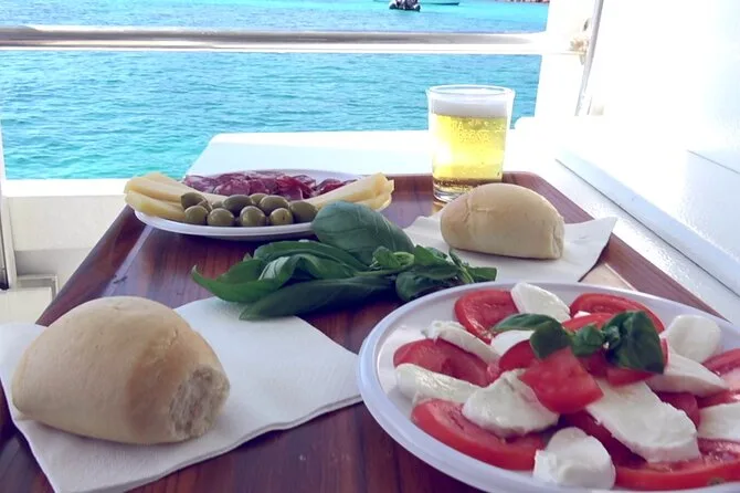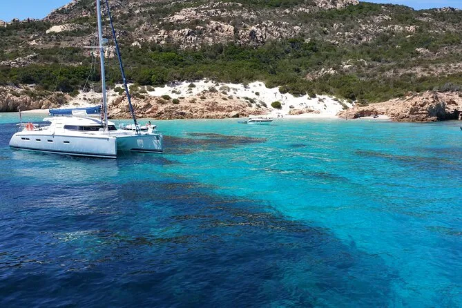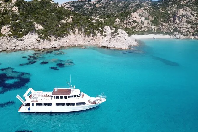 The tour includes a lunch break while anchored near Spargi Island; details may vary by operator.