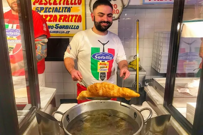 You’ll try taralli biscuits, mozzarella from a traditional shop, fried pizza (pizza fritta), gelato, sfogliatella pastry, babà cake, and limoncello.