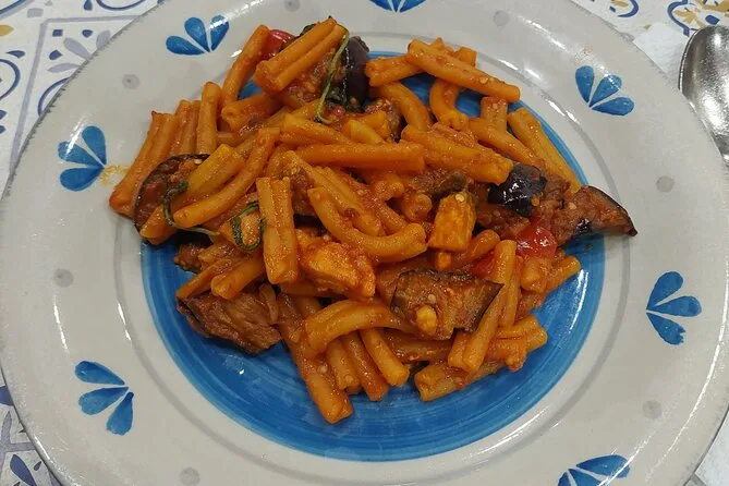 You’ll taste panino con panelle or crocchè, sfincione pizza, arancina rice balls, pasta alla norma or anelletti al forno, cannoli or cassata or granita.