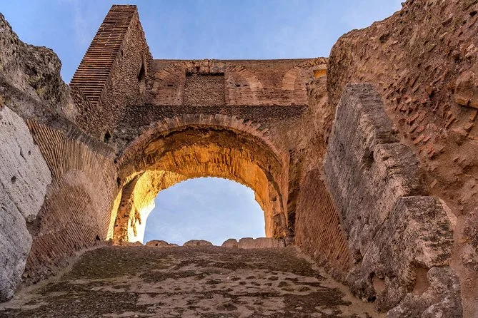 Colosseum arena floor entry, ancient stones underfoot, stories echoing through Rome’s ruins