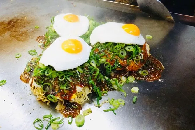 Your evening includes meeting up with your local guide in central Hiroshima before heading out for three drinks (your choice from each menu), a full plate of freshly made okonomiyaki cooked tableside, two more shared plates at neighborhood izakayas, plus group photos along the way—all wrapped up before midnight so you can catch public transport home if needed.