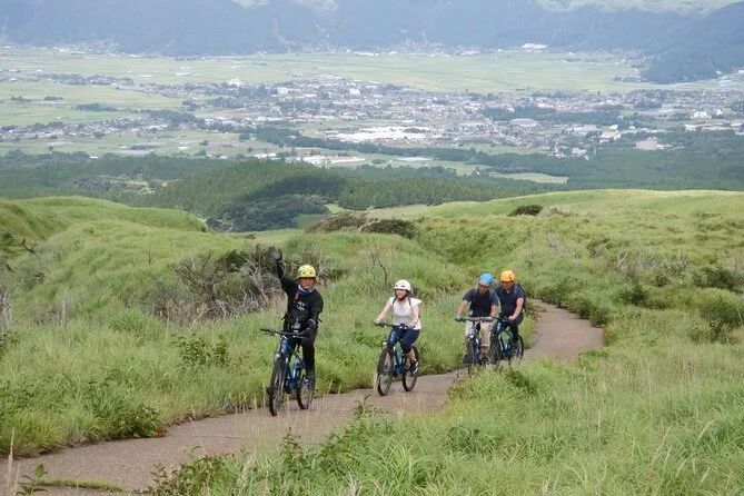 You’ll cycle from Aso Station up to Nakadake crater on an e-bike with a local guide, passing through sweeping grasslands and ancient paths once used by monks. Expect easy climbs thanks to electric assist, time for quiet views near the crater rim, and maybe even a post-ride soak in a hot spring if you ask.