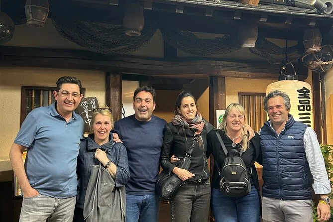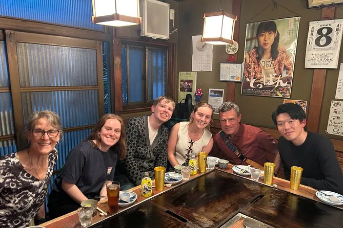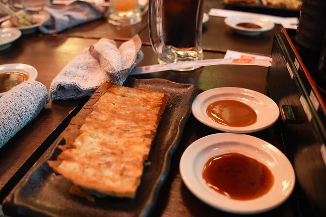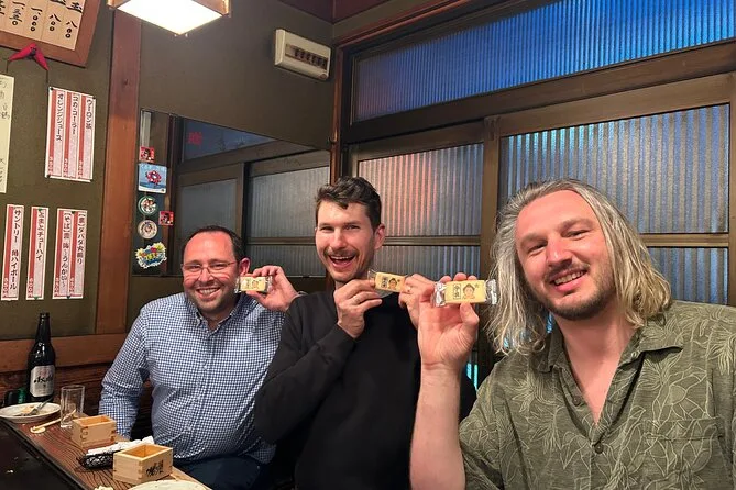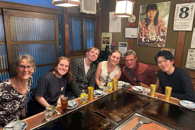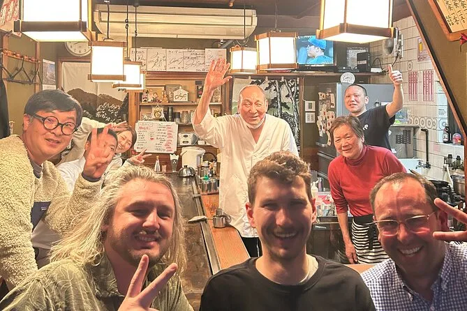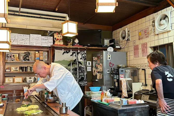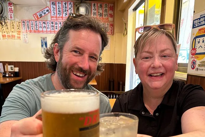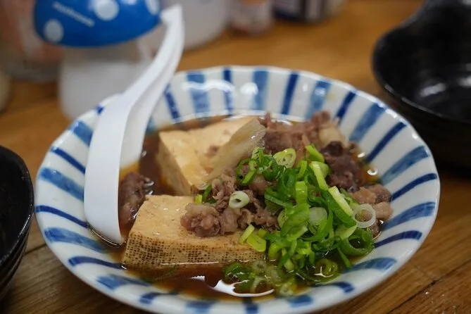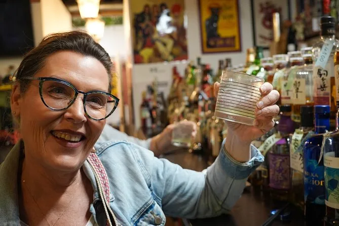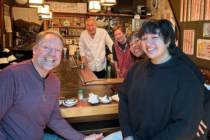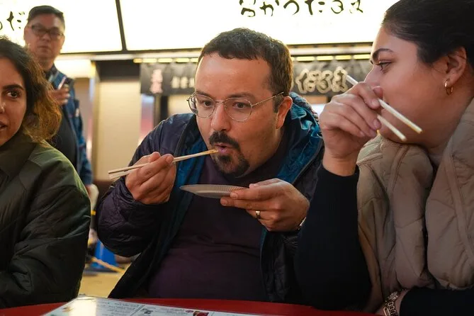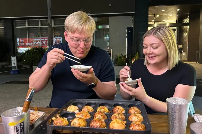 You’ll try kushikatsu (fried skewers), takoyaki (octopus balls), sashimi, and local drinks.