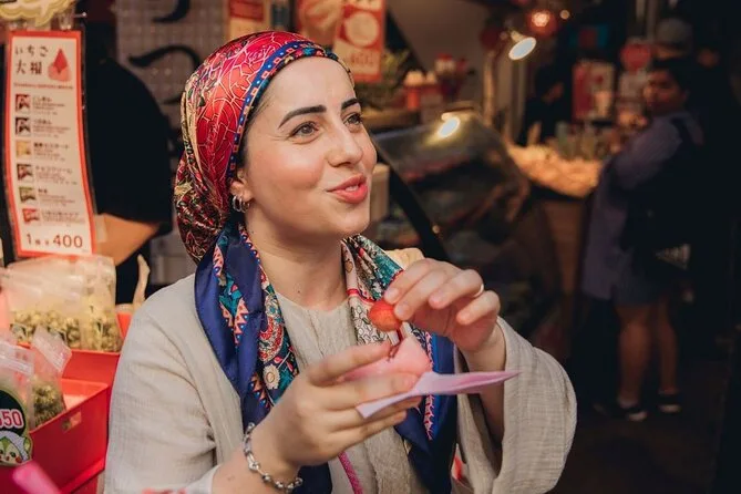 You’ll taste fresh sushi, Japanese snacks like grilled eel or seafood skewers, and traditional wagashi sweets.