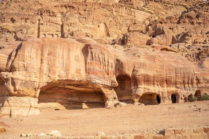 By 10:00 AM, we reached Petra’s entrance. The air felt warmer here—almost dry, with a hint of dust that clings to your shoes. Our guide handed out tickets and pointed us toward the Siq, that narrow gorge leading into the heart of the ancient city. Walking between those rose-colored cliffs is something else; you hear your own footsteps echoing off stone walls that have stood for centuries. First stop: the Djinn blocks. They’re these chunky stone monuments—locals say they’re named after spirits from old Arabic tales. Nobody knows exactly why they were built, but they look like silent guards watching over everyone who passes.