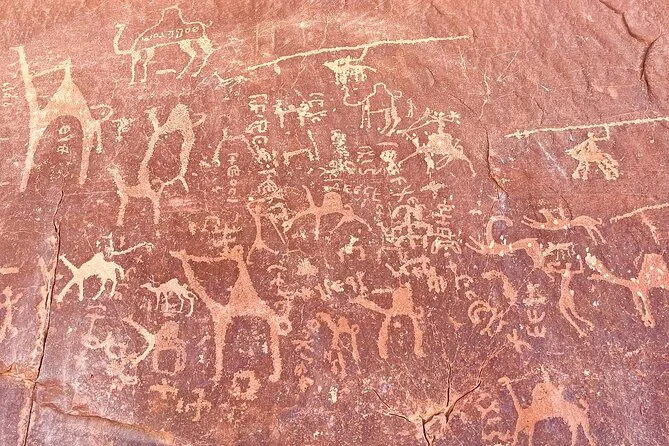 We stopped at Khazali Canyon and Fawaz pointed out ancient carvings — some looked like feet, others like animals or people. He told us how traders and pilgrims used this route for centuries. The rocks felt cool under my hand, almost damp compared to the sun outside. At Al Ramal Red Sand Dune, I tried running down (sand got everywhere), and some kids from another group cheered me on. Lunch was cooked over a fire behind a rock outcrop; fresh bread, hummus, yogurt — simple but honestly delicious after all that dust and wind.