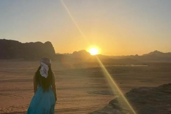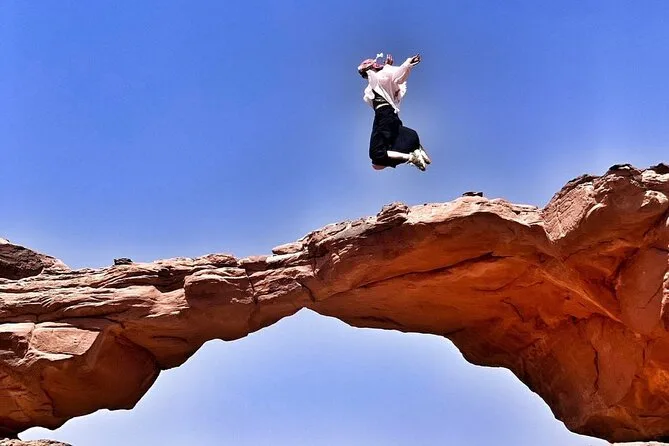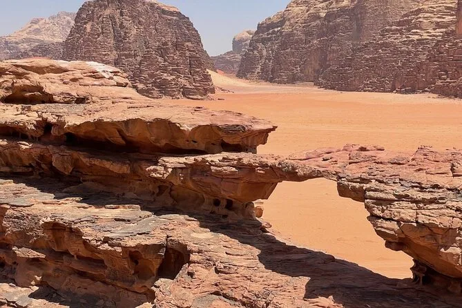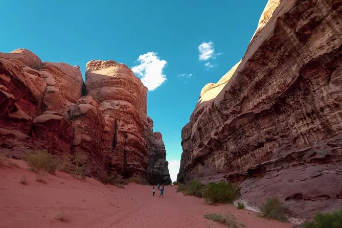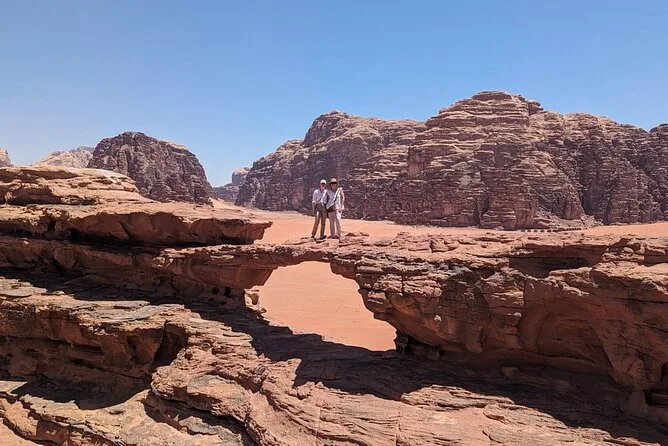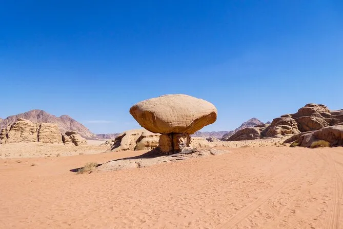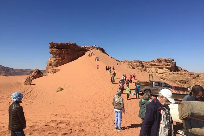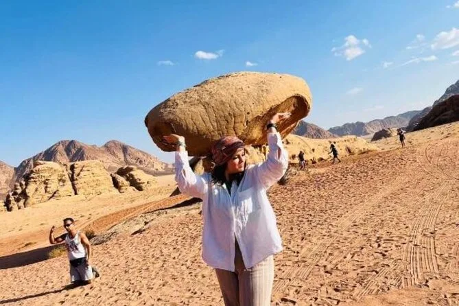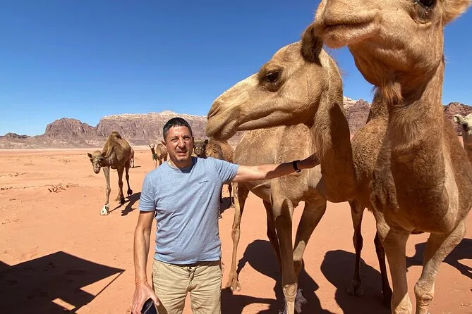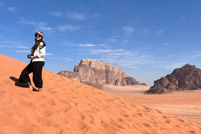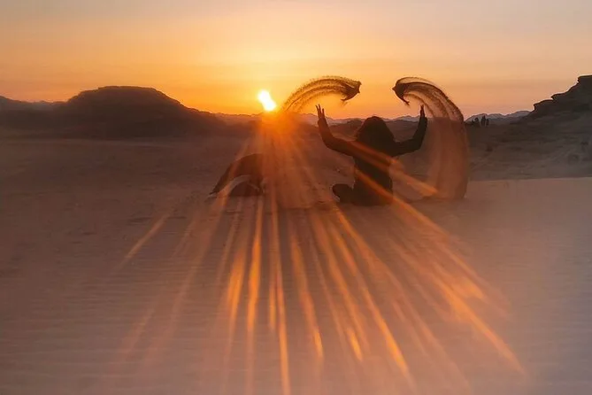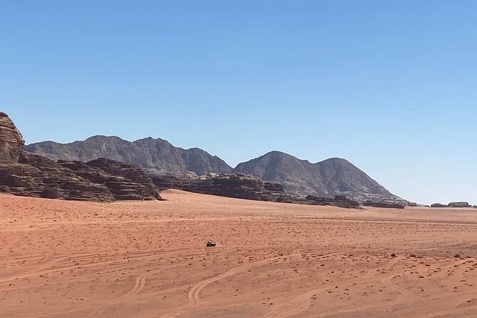 You’ll join a local guide for a full-day jeep adventure through Wadi Rum’s wild canyons and red dunes, with stops for ancient carvings and sweet Bedouin tea. After sunset views and dinner at camp, you’ll sleep under desert stars in a private tent — waking up to sunrise over endless sand is something you’ll remember long after the trip.