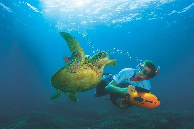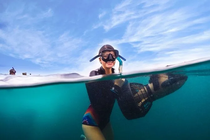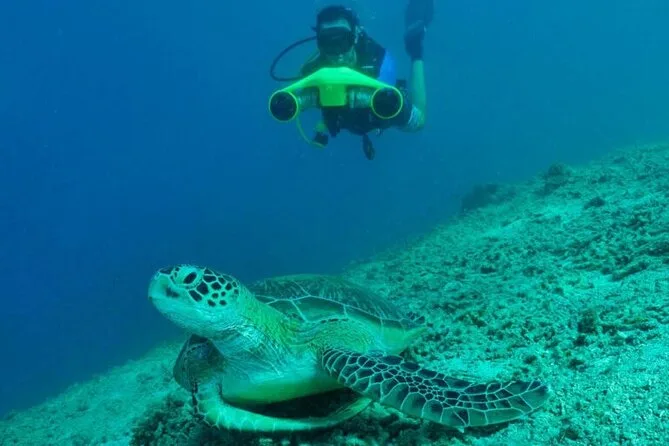 The first thing I noticed was how quiet it got once I dipped under — not silent, but kind of muffled, like the ocean was holding its breath. Our guide, Sami, showed me how to steer the underwater scooter (he called it a “sea bike,” which made me laugh) and waited until I nodded before letting go. It felt weird at first — you don’t kick, just grip the handles and let the little engine pull you along. My mask kept fogging up from nerves or maybe just excitement.