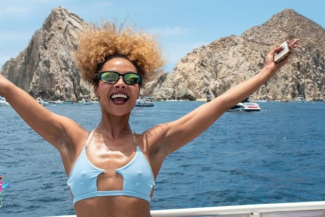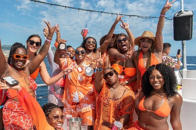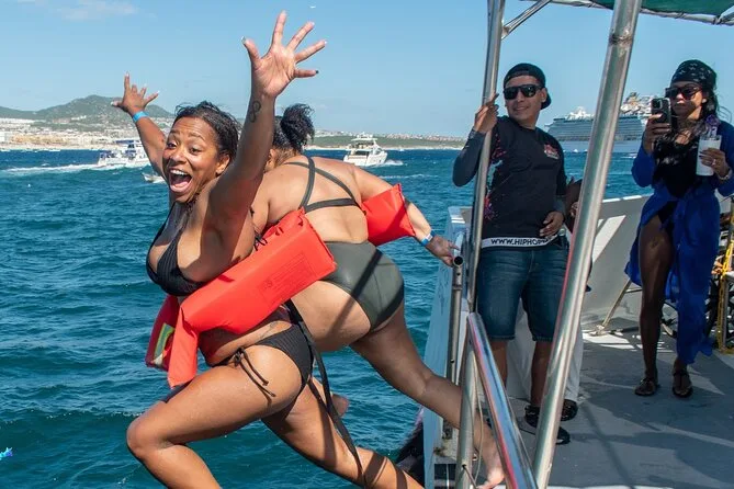 Your day includes a three-hour adults-only party boat cruise from Cabo San Lucas marina with nonstop DJ music (hip hop, R&B & Afro beats), unlimited open bar drinks (rum, tequila, vodka, beer), light snacks served onboard, fun games hosted by lively crew members plus wild champagne showers before returning to shore in the afternoon.