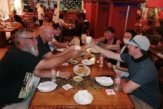Your evening includes guiding service throughout downtown Cancun’s best taquerías plus 6–8 different tacos (from shrimp to brisket or veggie), aguas frescas as a welcome drink, a tequila tasting session along the way and fresh churros for dessert before heading back—with optional hotel pickup if needed.