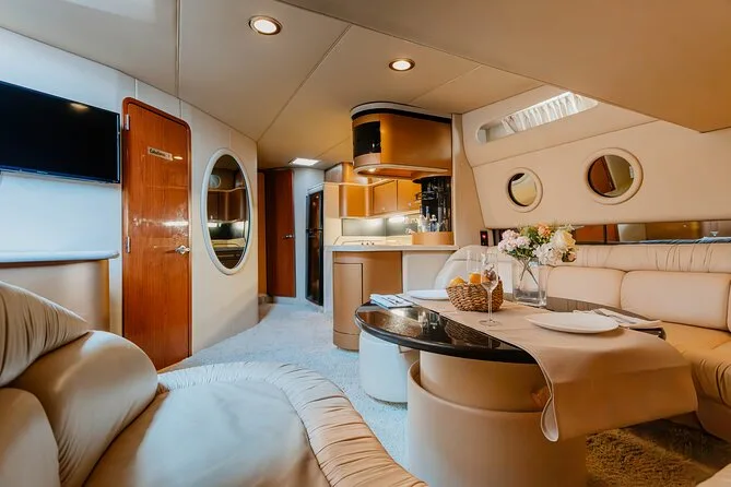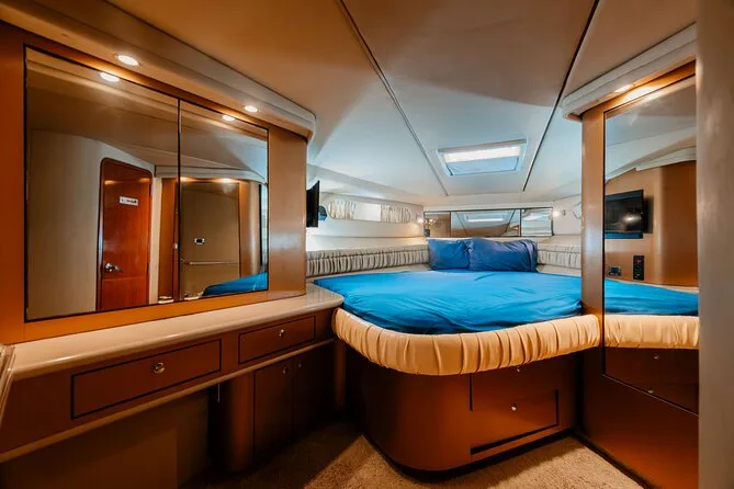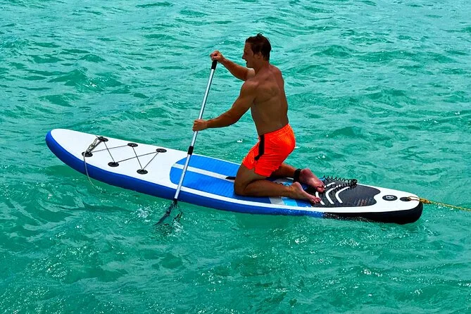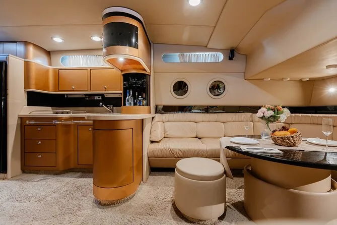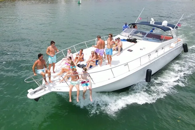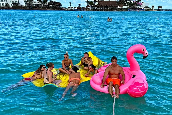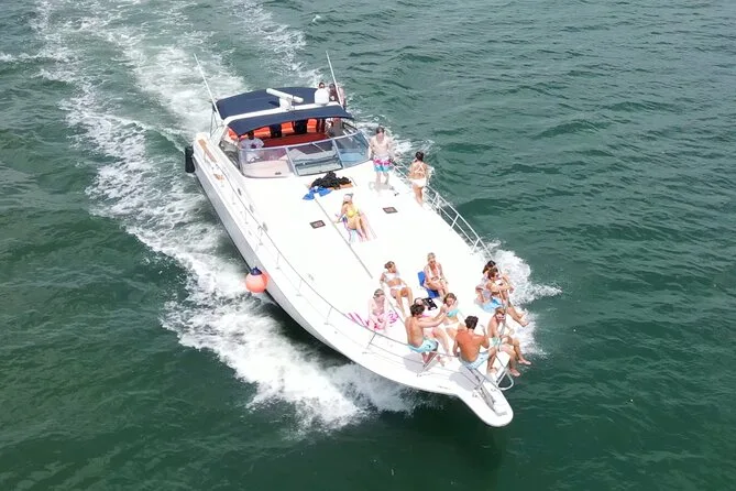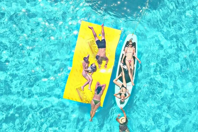 Your day includes rental of a spacious 55ft luxury yacht with licensed captain and two crew members, use of snorkeling gear and paddle board, three bags of ice plus plenty of bottled water and sodas for everyone onboard—and yes, you can bring your own snacks or drinks too (just skip red wine). Floating mats are available for relaxing right on the water before heading back to port whenever you’re ready.