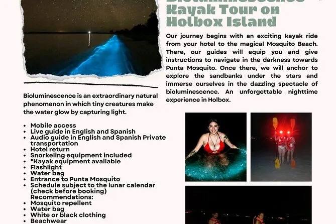 Your evening includes private pickup from your hotel on Holbox Island by all-terrain vehicle, all kayak gear ready at Mosquito Beach, bottled water for the trip, use of snorkeling equipment if you want to swim with the glowing plankton at Punta Mosquito, plus all entry fees and taxes handled by your local guide before heading back late at night.