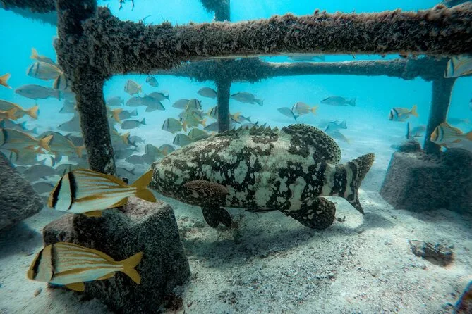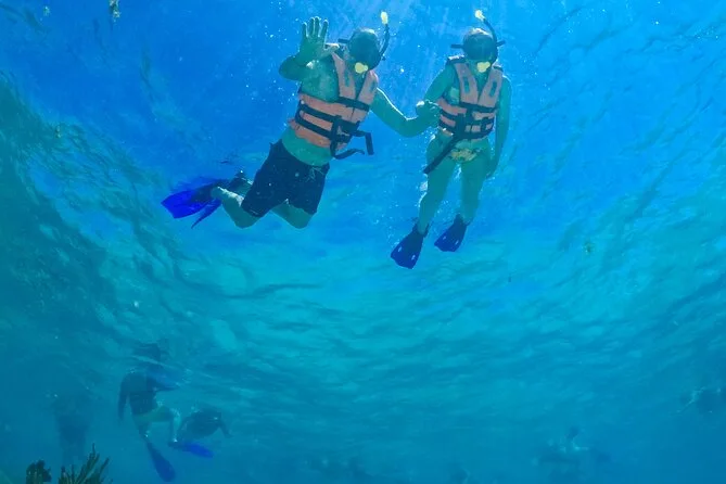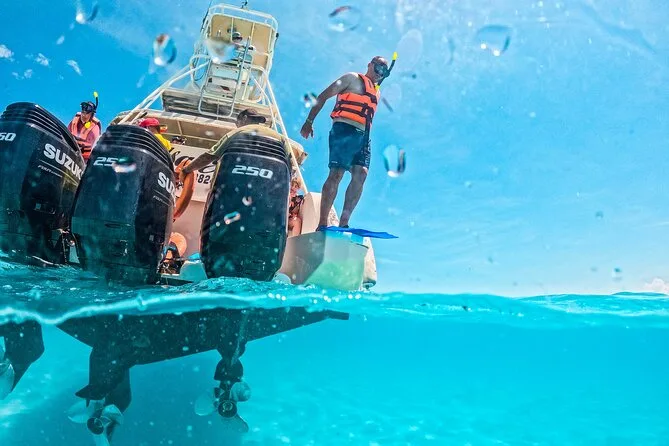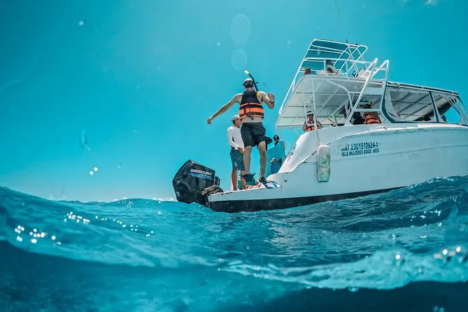 Your day includes private round-trip hotel pickup in Cancun, all snorkeling gear for reef swimming near Isla Contoy, coffee break onboard, bilingual local guide throughout, plus a fresh Caribbean-style lunch with beer (after swimming). You’ll travel by private speedboat between islands and have free time to explore Isla Mujeres before returning in the afternoon.