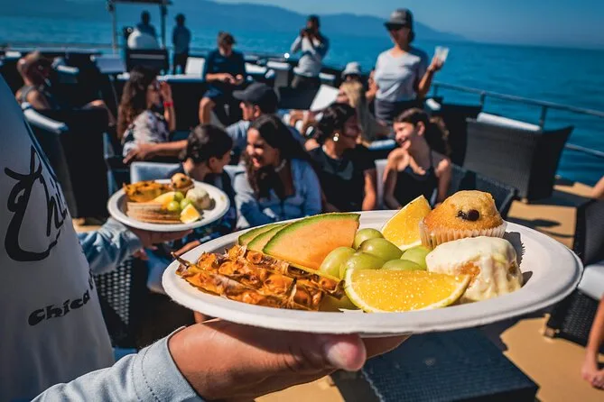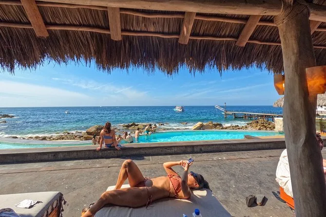 Your day includes breakfast snacks on board as you cruise from Puerto Vallarta by catamaran to Playa Chica Locca with all port entry fees covered. At arrival you’ll have unlimited access to an open premium bar (cocktails, wine, beer), fresh guacamole with blue corn chips as a welcome snack plus use of kayaks, paddleboards and snorkel gear all day long. Lunch features grilled fajitas (chicken or beef), rice and beans with tortillas—vegan and vegetarian options too—and there’s always shaded lounges or an infinity pool waiting when you need them most before cruising back at sunset.