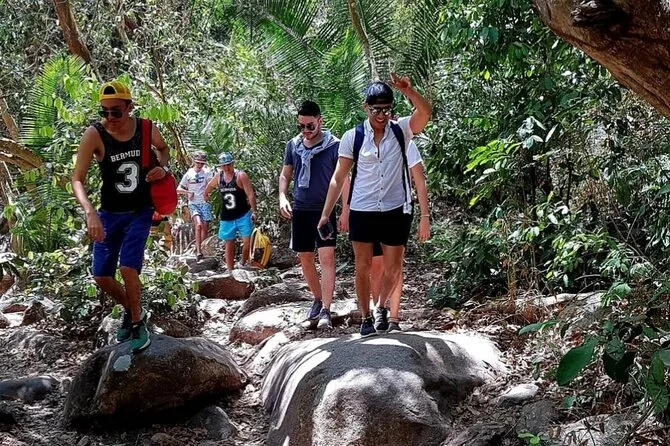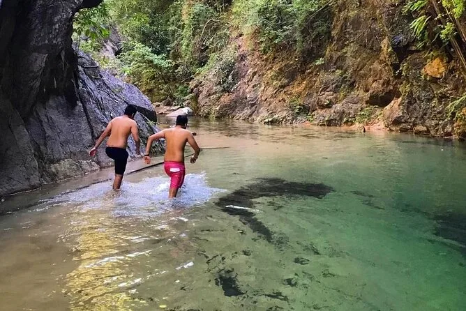 Your day includes city bus fare from central Puerto Vallarta into the jungle, guidance along forest trails with river crossings, fresh fruit for a snack by the falls, plus time to swim under waterfalls before heading up to a mountain lookout over Banderas Bay.