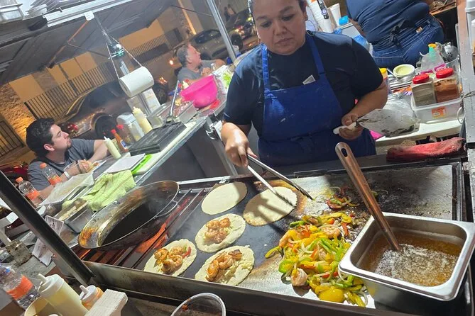 You’ll wander Puerto Vallarta’s lively Old Town by night with a local guide, tasting tacos hot off the grill and sipping agua fresca between stops. Expect five or more food tastings—from arrachera to cabeza—and finish with handmade ice cream or a popsicle before heading home full and happy.