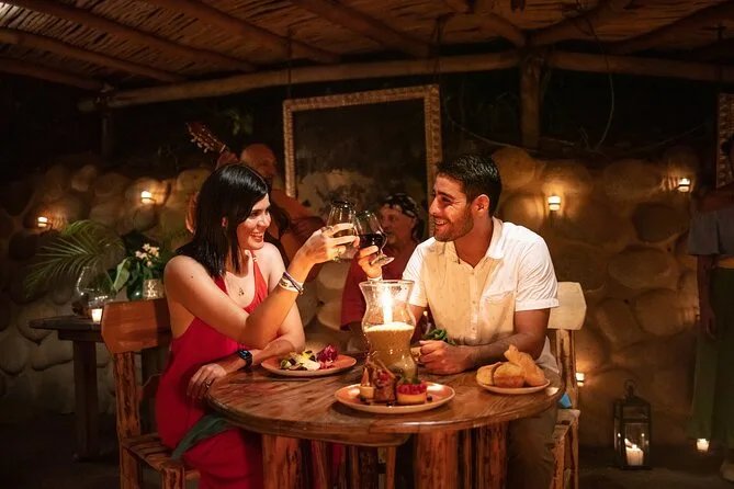 The tour includes an unlimited open bar, international buffet dinner by candlelight, and entry to the ALMA dance show at Las Caletas.