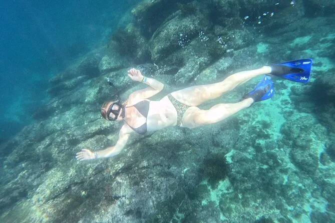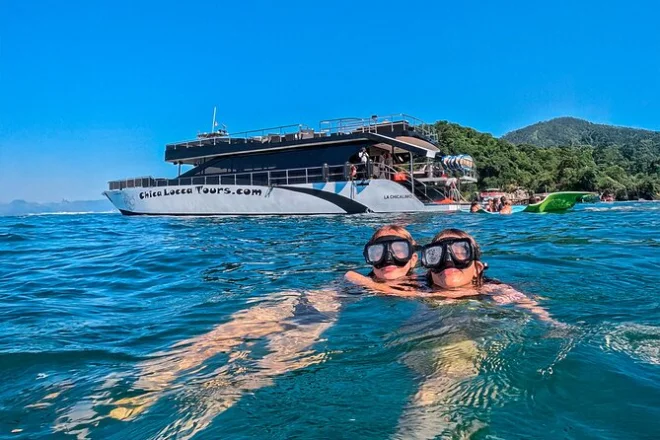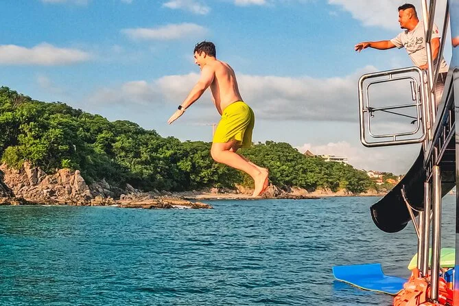 First stop: Quimixto. I’m not usually brave about jumping from high places but there I was, egged on by strangers-turned-friends, launching off the second deck into water that felt cooler than I expected. The snorkeling gear was included (thank god — I always forget mine), and under the surface it was all flickers of silver fish and muffled voices above. Back onboard, guacamole appeared out of nowhere — blue corn chips too — and someone convinced me to try a piña colada before noon. No regrets.