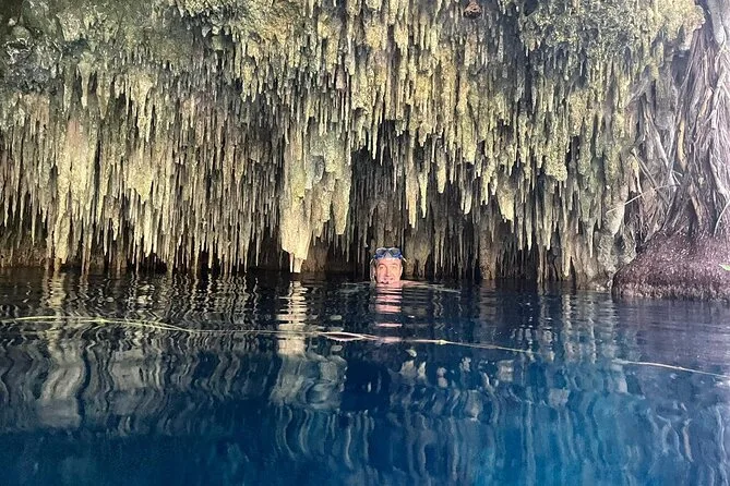 The first cenote was cool and glassy — not icy, just enough to wake you up. Luis handed out life jackets and goggles (I’m not a strong swimmer so that helped), then pointed at these tiny fish darting around my toes. He told us some Mayan stories about cenotes being sacred gateways; I tried to picture ancient ceremonies here while my friend splashed me with water. Each pool had its own vibe: one was deep blue with roots hanging down like curtains, another felt almost hidden under thick trees. At one point I just floated on my back listening to nothing but birds and my own breathing — weirdly peaceful.