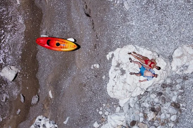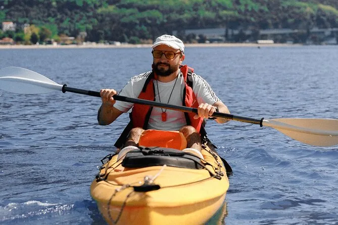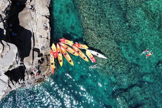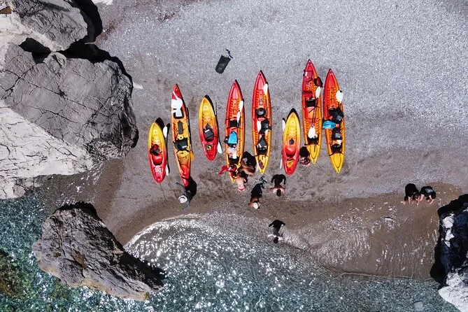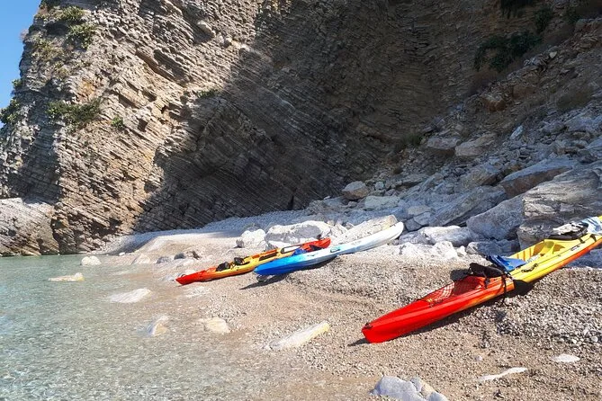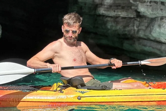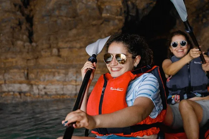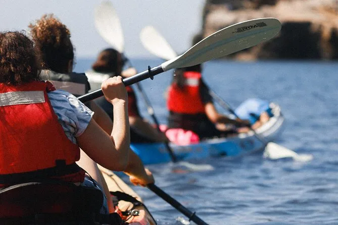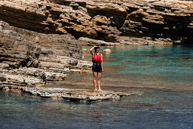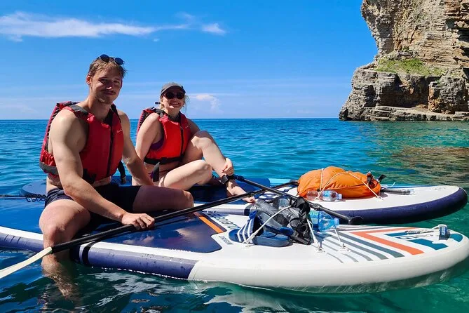 The paddling route takes you along the coast with several stops; timing depends on group pace but includes time for swimming and exploring.