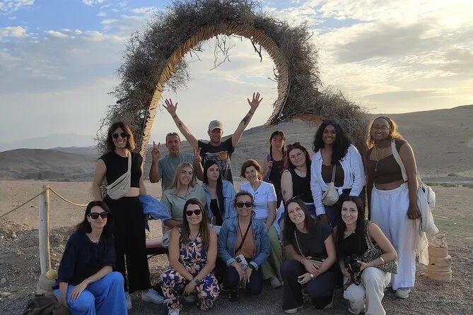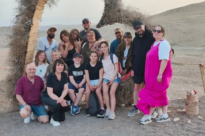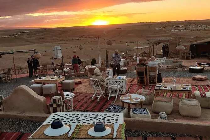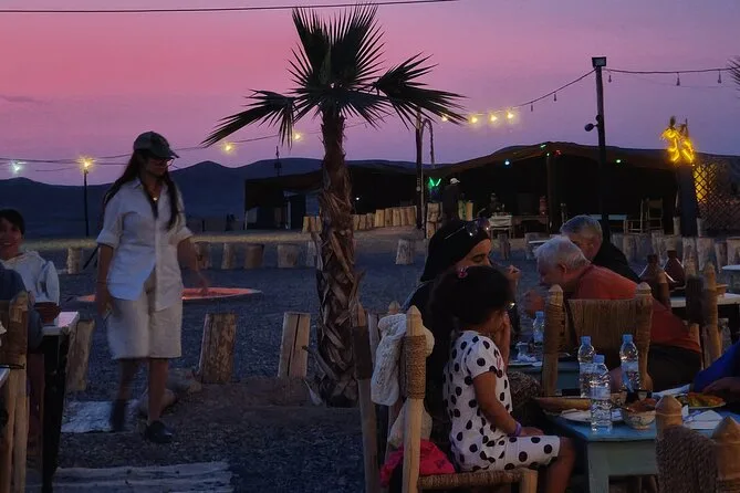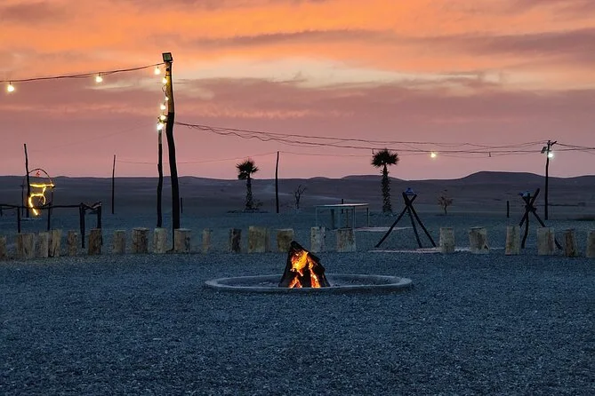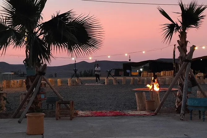 Your evening includes pickup and drop-off at your hotel in Marrakech by air-conditioned vehicle, a 20-minute camel ride through Agafay Desert scenery, bottled water along the way, dinner at a luxury Berber camp with vegan/vegetarian choices available, live Gnawa music plus fire show entertainment—and even some free photos snapped by your hosts before heading back to town.